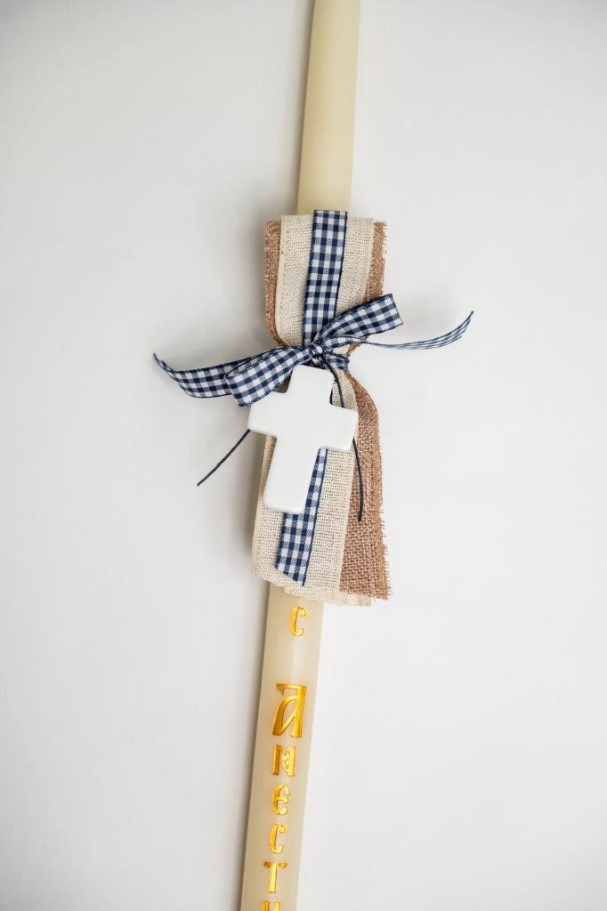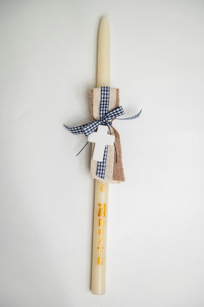 Hessian natural and blue checked ribbons with a white cross on a Double sided in Greek and English “Christ is Risen” Ivory candle (IvyEC26-39)