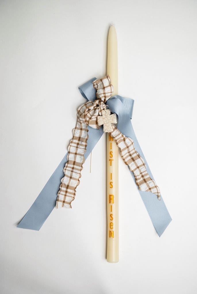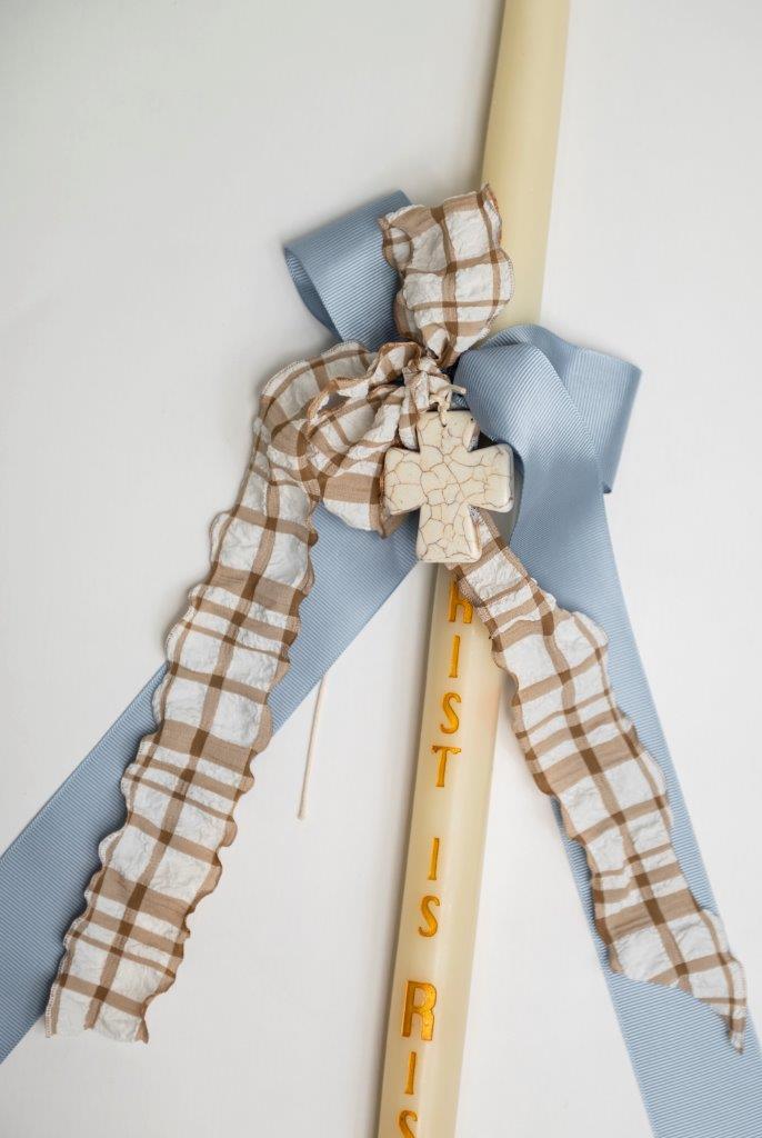 Light blue and brown tartan ribbons with stone look cross on a Double sided in Greek and English “Christ is Risen” Ivory candle.