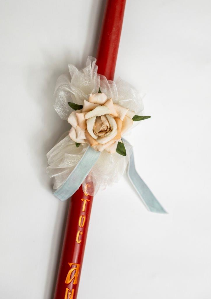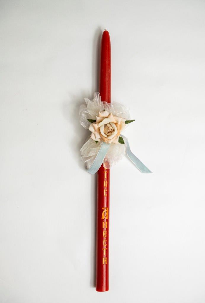 Misty blue velvet ribbon an ivory organza and an antique rose on a Double sided in Greek and English “Christ is Risen” Red candle.