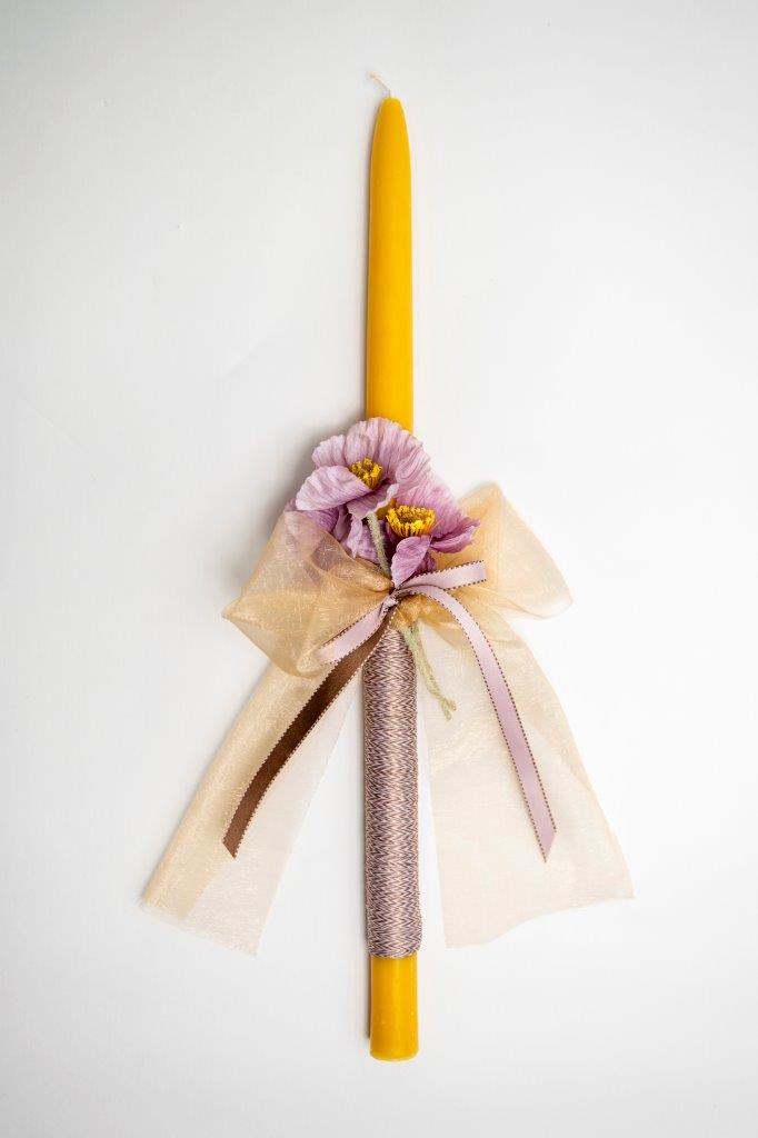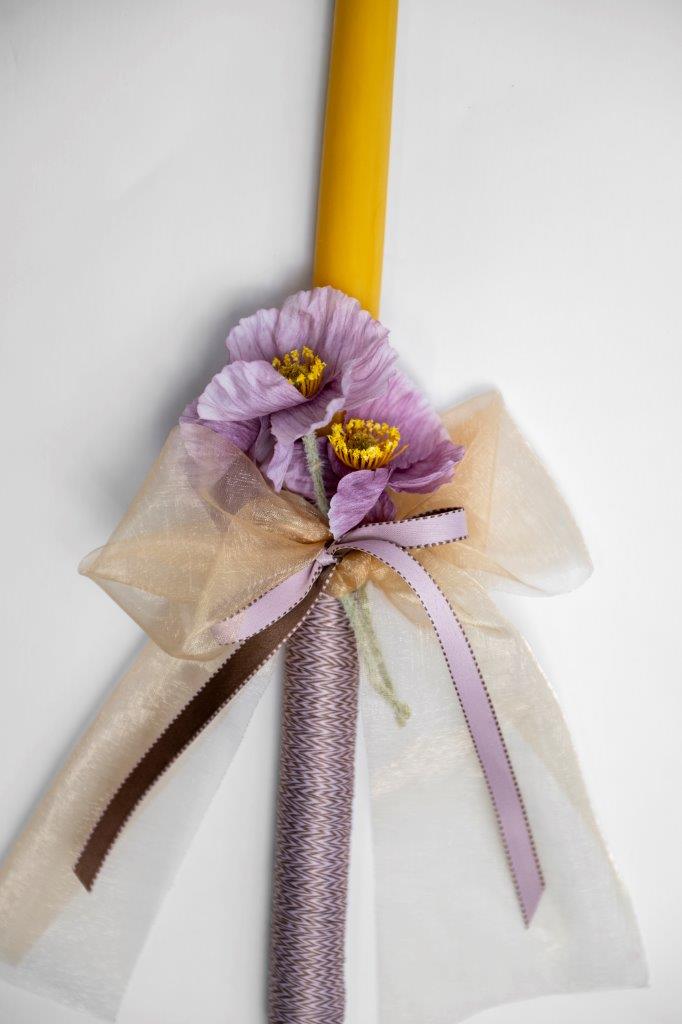 Pink herringbone cord with latte organza ribbon and lilac poppy flowers on a Pure beeswax candle.