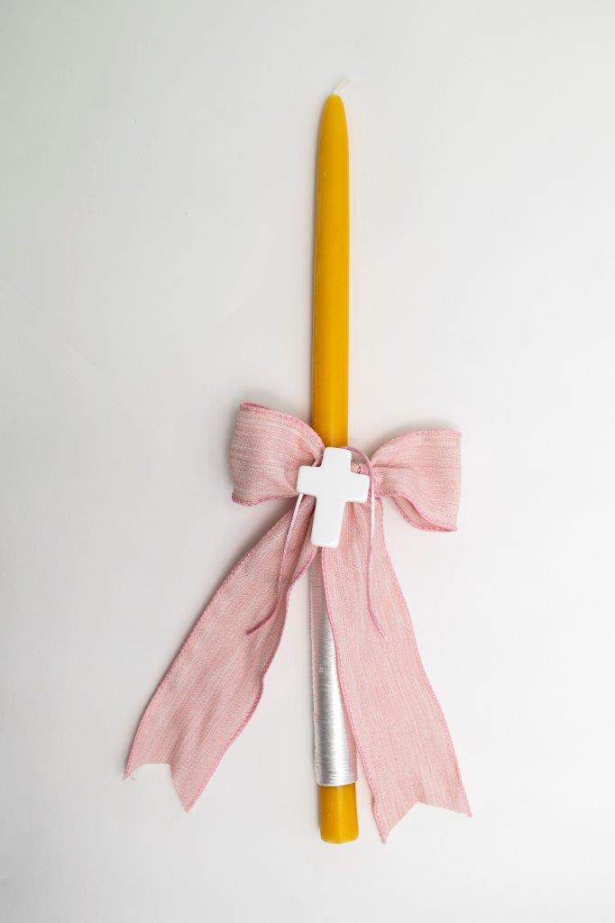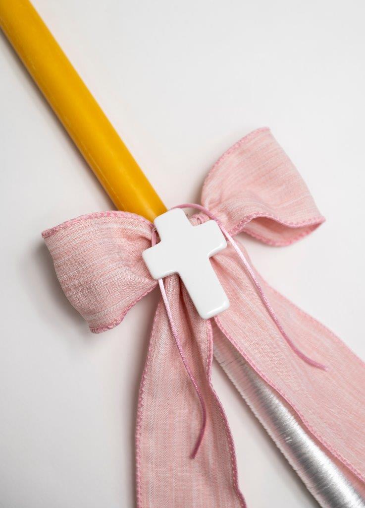 Pink ribbon with white cord and white cross on a Pure beeswax candle.