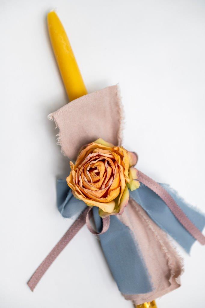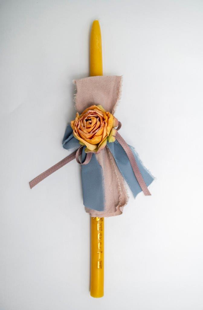 Natural and blue frayed edge ribbons with a yellow burnt rose on a Double sided in Greek and English “Christ is Risen” Pure beeswax candle.