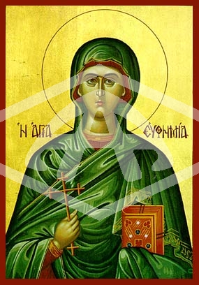 SAINT EUPHEMIA, THE GREAT MARTYR 7140 St. Euphemia was the daughter of noble Christian parents. When a pagan festival was held in the city, she and 48 other Christians hid themselves to avoid the worship of idols. They were caught and brought before Priscus, the proconsul, who tortured them. Then he tried to induce her through flattery to sacrifice to idols, but she remained unmoved. Maddened, Priscus ordered her to be killed, but God miraculously preserved her three times, until finally she was martyred in 303 AD, to the mouths of wild beasts.
