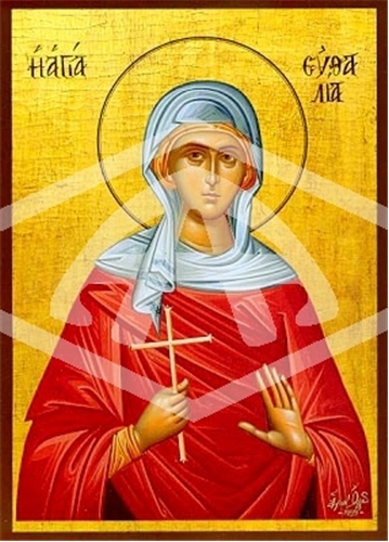 SAINT EUTHALIA , VIRGIN-MARTYR, OF SICILY 7178 The Holy Martyr Euthalia lived with her mother and brother in the city of Leontina on the island of Sicily. By a miraculous healing of the mother Euthalia and her mother were baptised. But Euthalia’s pagan brother, having learnt of their baptism, went into a violent rage. The mother succeeded in fleeing, but Saint Euthalia confessed herself a Christian and accepted a martyr’s death. After fiercesome torture the saint was beheaded with a sword.