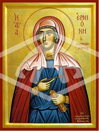 SAINT HERMIONE, VIRGIN-MARTYR 9106 St. Hermione was one of St. Philip the Deacon’s four daughters. St. Hermione became a healer to many. St. Hermione was brought before Emperor Trajan (98-117 AD) and was severely beaten and tortured, however because of her close connection and love towards Christ she was unharmed. When they led her to a pagan temple, she prayed and the idols crumbled. She was finally beheaded.